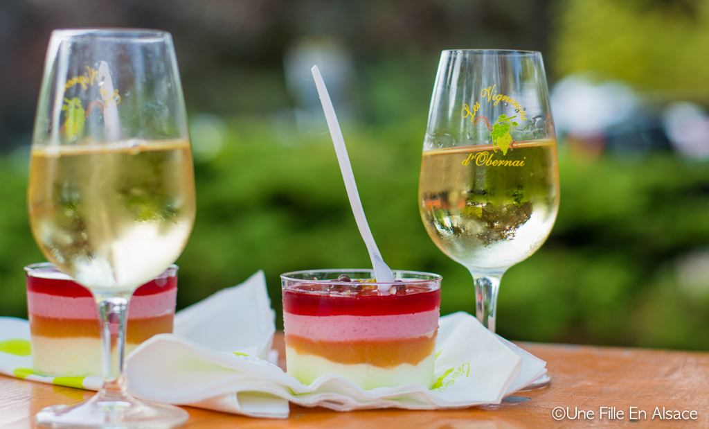 - Dessert : Le délice des marcheurs proposé par la Pâtisserie Gross d’Obernai (une surprenante mousse bien fraîche qui m’a beaucoup plu alors que d’ordinaire je ne suis pas une adepte des mousses) – Gewurztraminer du Domaine Ohresser