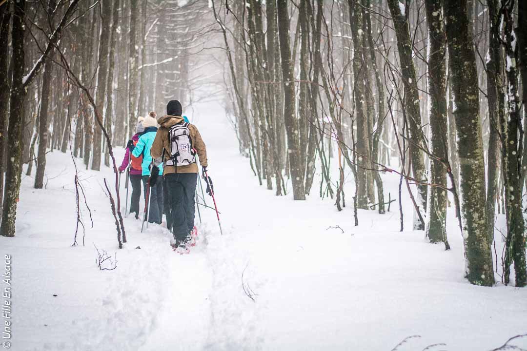 Me balader en raquette dans les Vosges sous la neige, j’adore ça définitivement ! Et pourquoi ne pas se faire guider pour une fois et profiter d’une randonnée à la tombée de la nuit autour du Champ du Feu ? C’est la deuxième fois que je fais cette sortie et c’est toujours un plaisir et un vrai moment de convivialité !